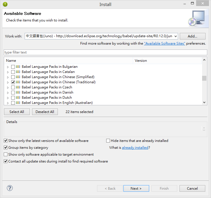 依照你的Eclipse版本「Luna」、「Kepler」、「 Juno」來安裝對應的語言擴充包。